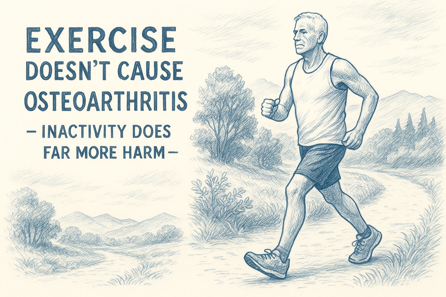 The belief that exercise or joint loading causes osteoarthritis comes from a purely mechanical view of human joints. Cartilage, tendons, ligaments, and subchondral bone are not static materials. They are living tissues designed to respond to load. Intermittent compression improves nutrient diffusion into cartilage, keeps synovial fluid circulating, strengthens bone, and maintains collagen alignment in ligaments and tendons.