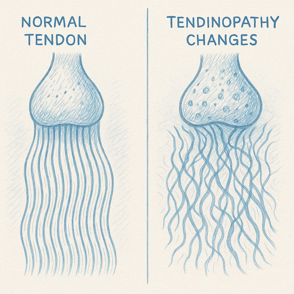 Tendinopathy means the tendon is not adapting well to load. Alternatively, it may be failing due to the absence of a load. In tendinopathy, the tendon is struggling. It may have microdamage, disordered collagen, and zones that are less capable of repair.