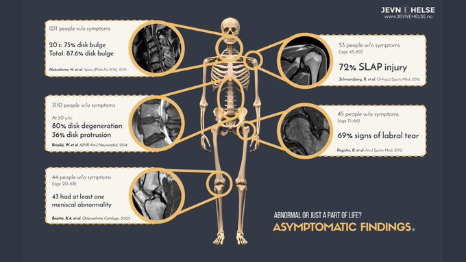 Almost no one over 55 has a “normal” MRI of the knee or shoulder. Degenerative meniscus tears, rotator cuff thinning, labral tears, mild arthritis—these are normal age-appropriate findings in most… not pathologies demanding surgery.